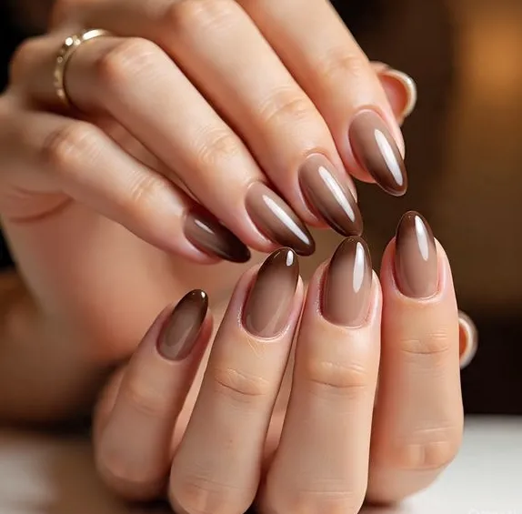 This is a deep, smooth brown color that looks like melted chocolate. It’s one of the easiest brown nail styles for beginners because it does not need any design. Just paint, seal, and you’re good. It looks rich and clean, especially when it’s glossy.