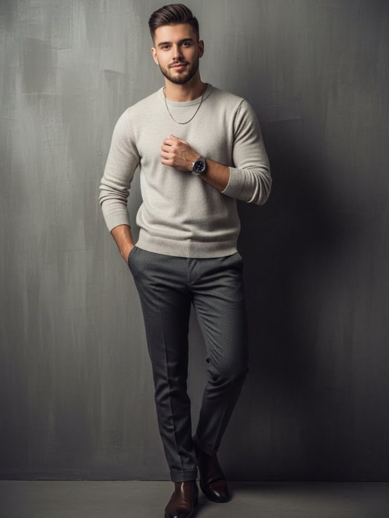 A soft sweater in grey, cream, or navy paired with dark pants feels warm and approachable. This outfit works very well for evening dates, cafés, or cooler weather. It gives calm and mature energy.