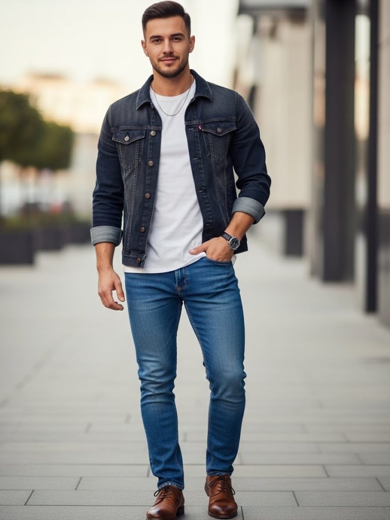 A denim jacket adds structure without looking forced. Wear it over a plain T-shirt and jeans. This look is youthful and confident. Perfect for outdoor dates or casual evening plans.