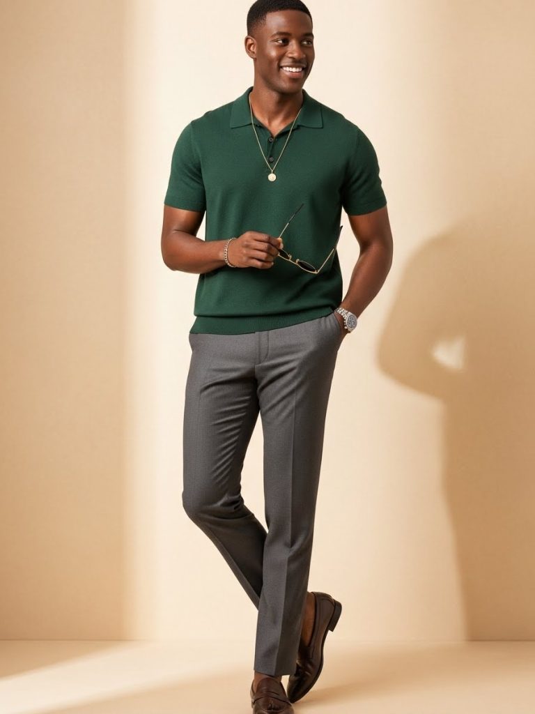 A knit polo looks more mature than a regular polo. Pair it with tailored pants for a smooth, confident look. This is perfect for dinner dates where you want to look sharp but not stiff.