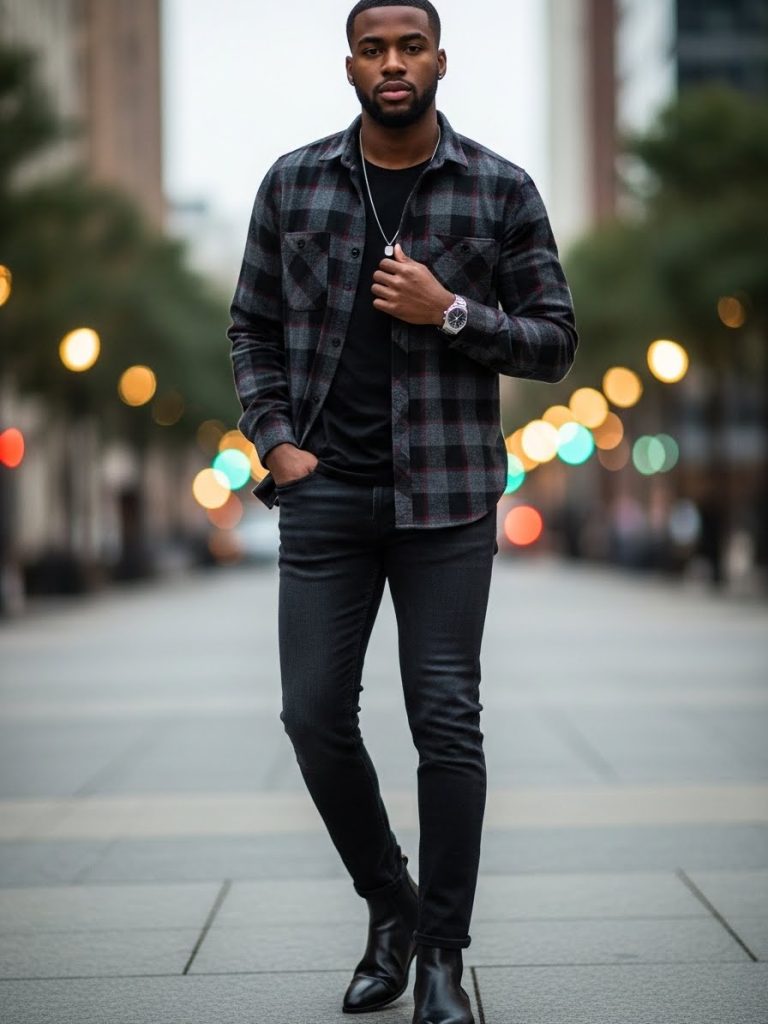 Flannel shirts bring warmth and comfort. Wear it buttoned or open over a T-shirt. This look feels friendly and natural. Good for outdoor or casual dates.