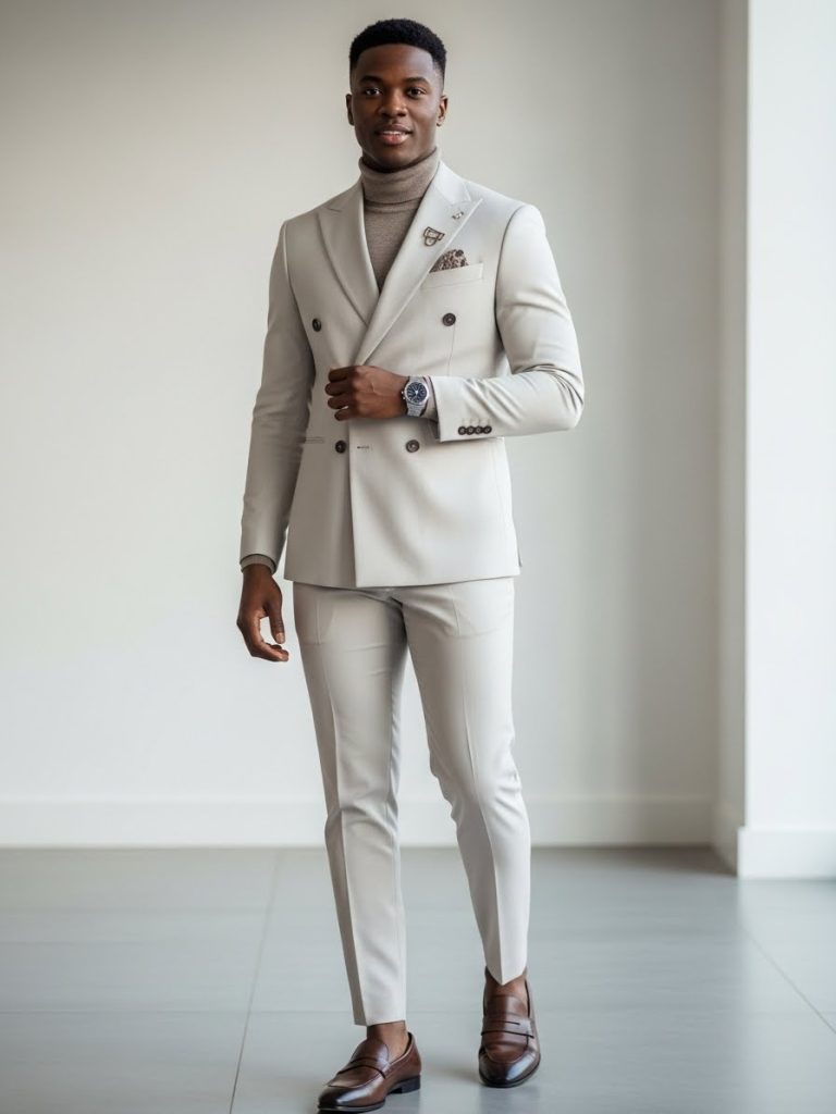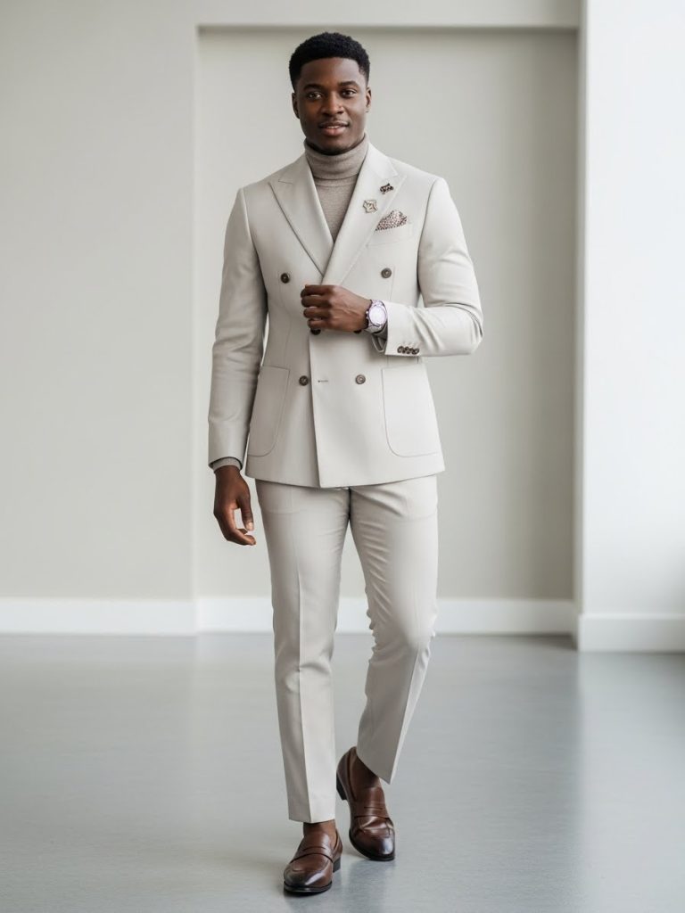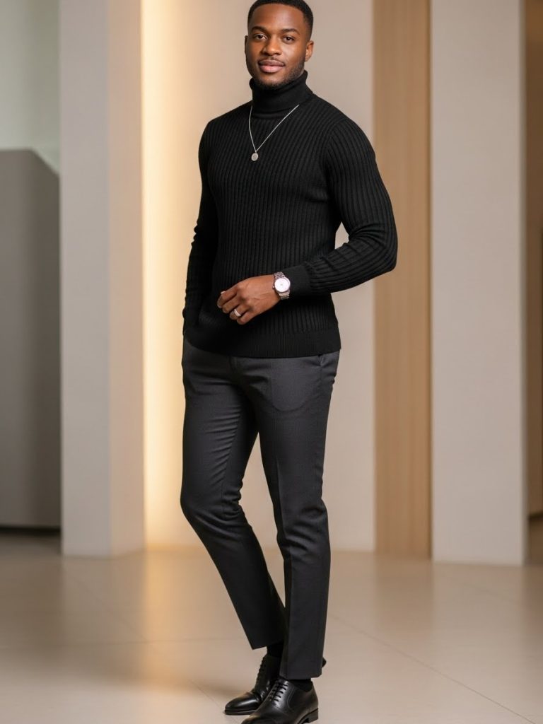 A fitted turtleneck paired with slim pants looks very clean and confident. This is a strong choice for cooler weather and evening dates. It gives calm masculine energy.