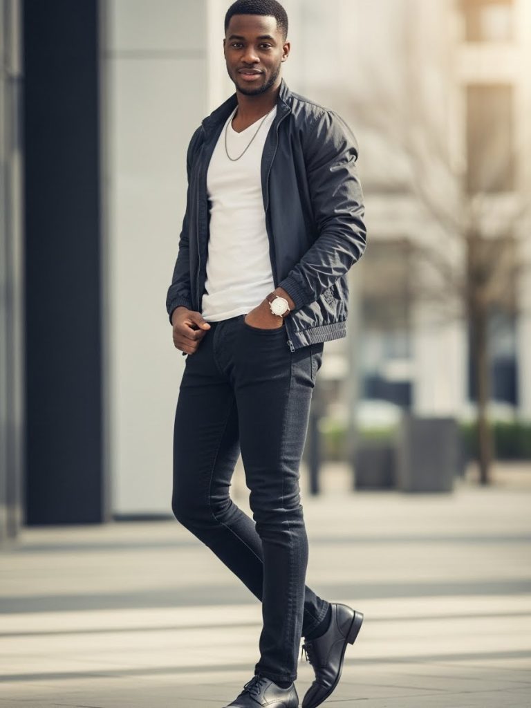 A lightweight jacket adds structure and style. Choose neutral colors. This outfit works well for unpredictable weather and casual dates.