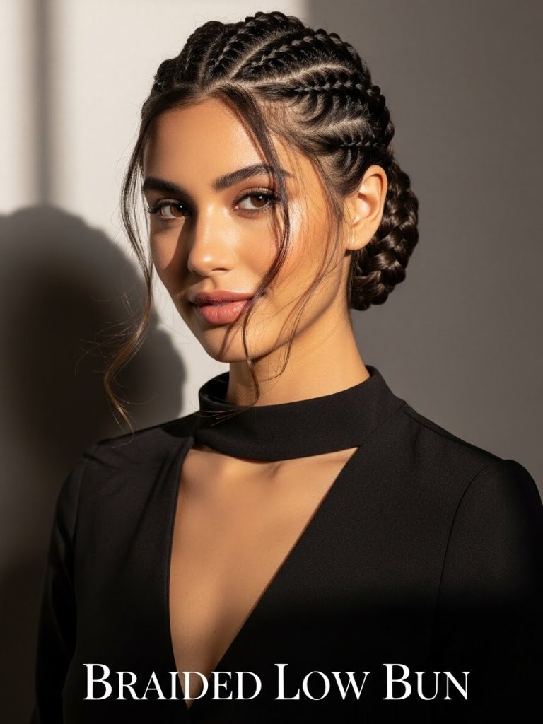 Braids gathered into a low bun give a calm and elegant look. This style is perfect for office settings, formal events, or days when you want to look polished.