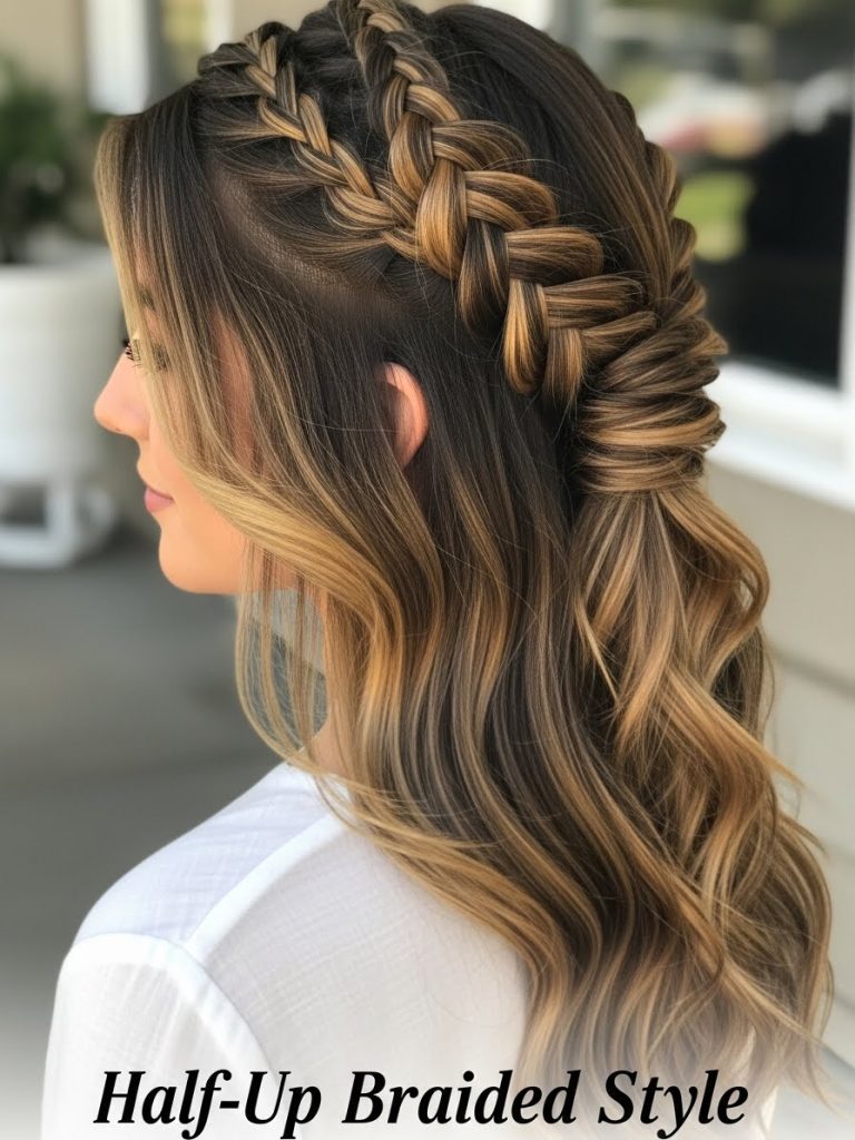 The braids are guided gently to one side. This style frames the face and gives a soft, feminine look.