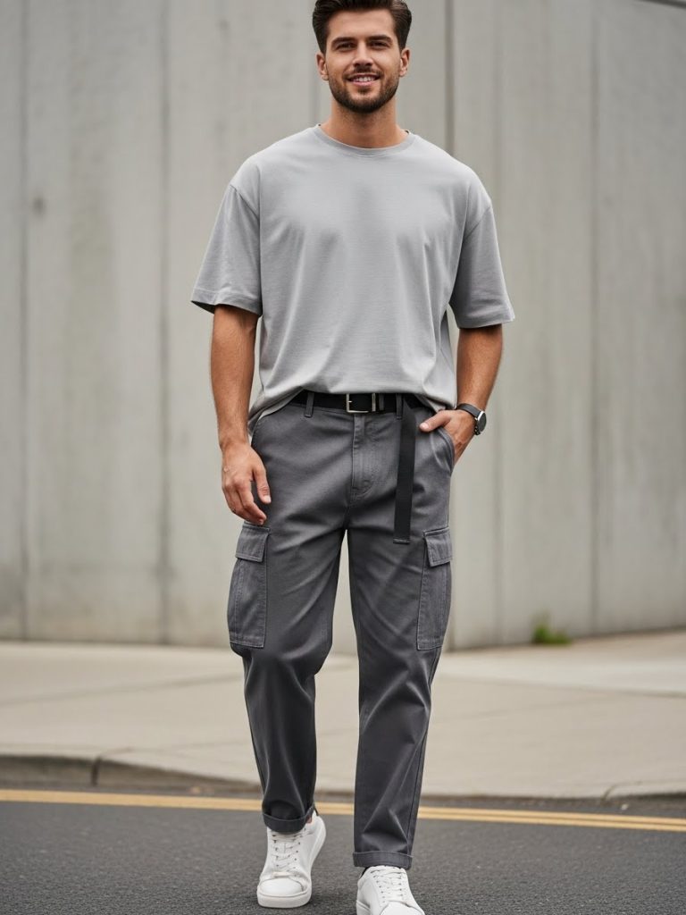This outfit is simple but powerful. An oversized t-shirt paired with relaxed cargo pants gives you comfort and a cool street vibe. Neutral colors like black, grey, or olive work best. Add clean sneakers and you are ready for the day.