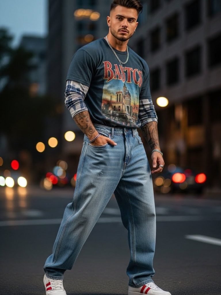 Graphic tees add personality. When paired with baggy denim pants, the outfit feels youthful and confident. Keep the shoes simple so the outfit does not feel too loud.
