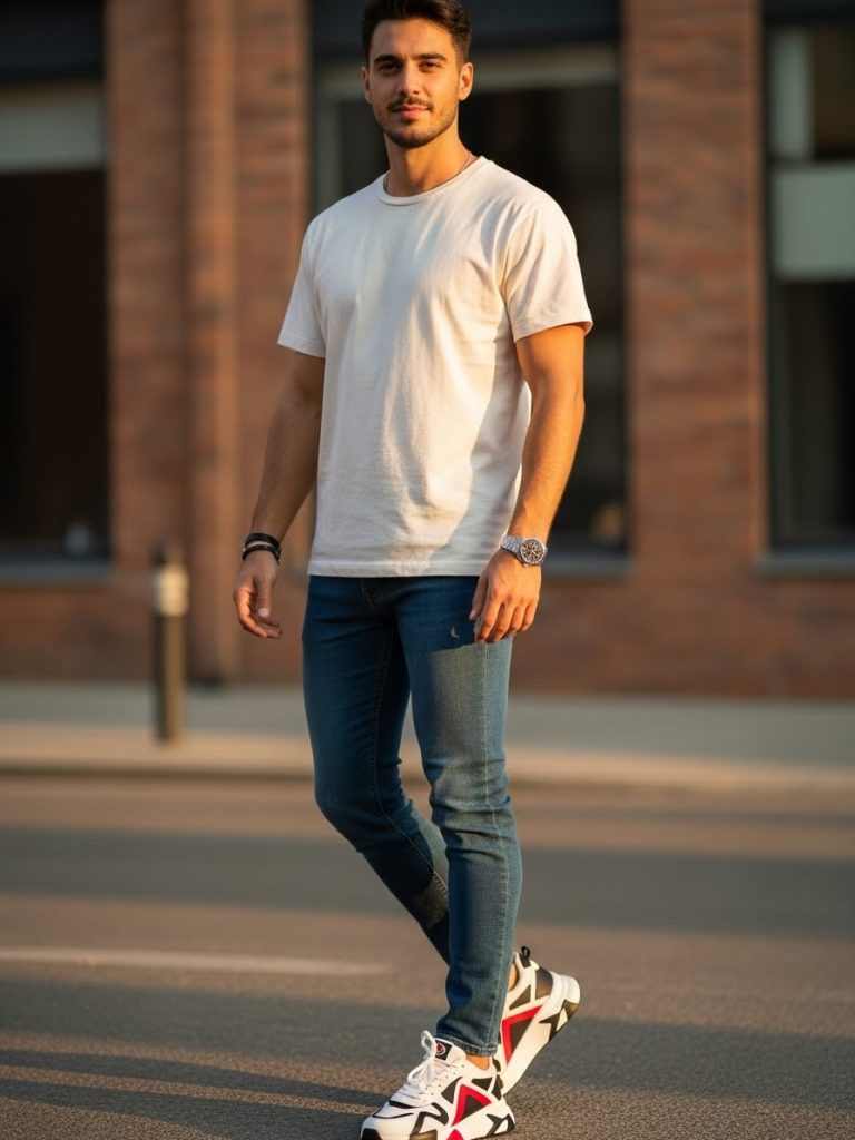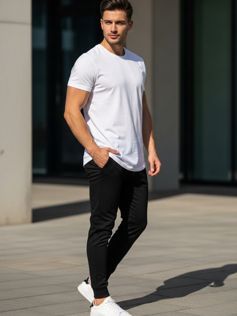 Sometimes simple is best. A clean white t-shirt with black joggers gives a fresh and neat street look. This outfit works for errands, casual days, or travel.