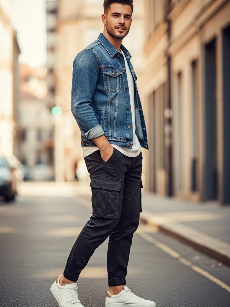 Outfit Idea 6 – Denim Jacket with T-Shirt and Cargo Pants