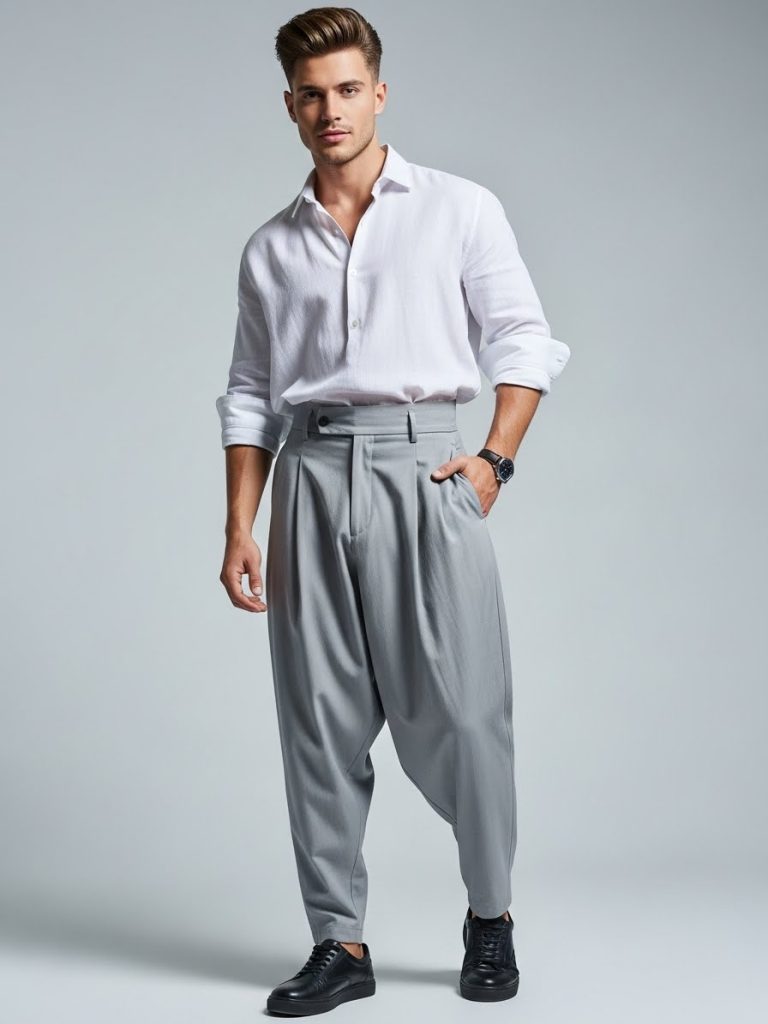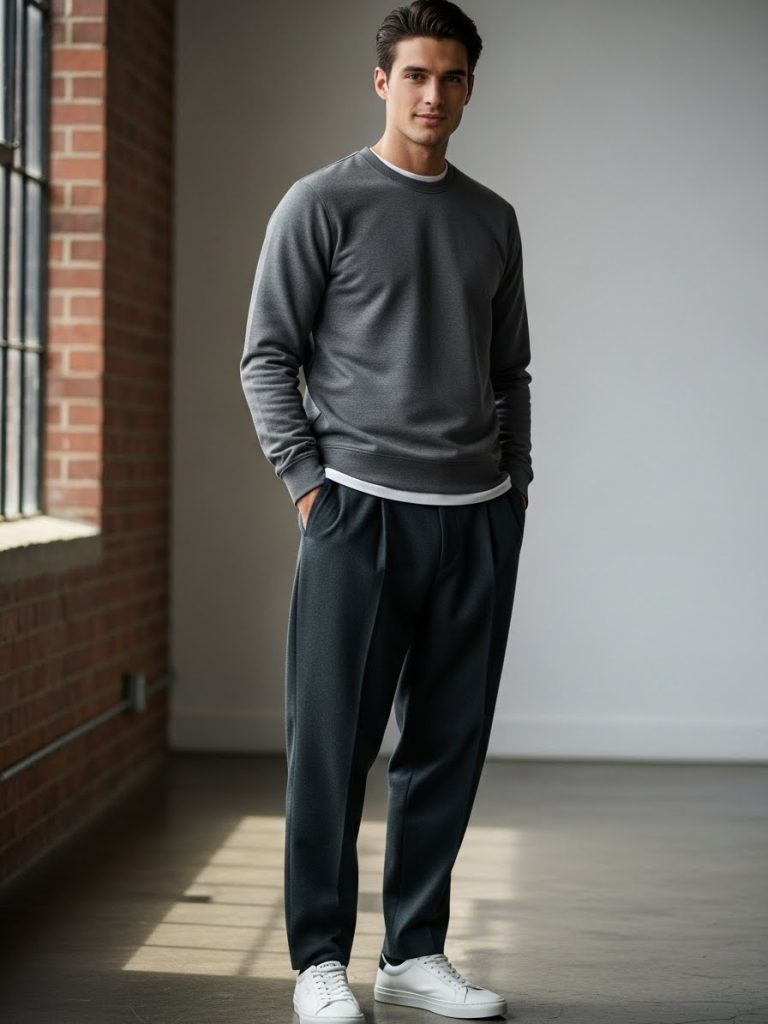 Loose-fit trousers are trending in 2026. Pair them with a basic sweatshirt for a smart streetwear look. This outfit feels calm, mature, and stylish.