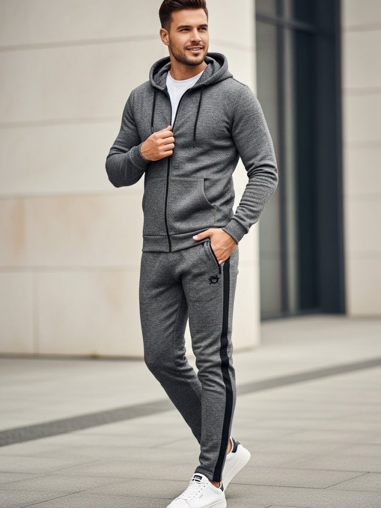 Zip-up hoodies are very practical. Pair them with track pants for a sporty streetwear look. This outfit is comfortable and great for long days.