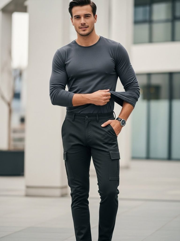 A long-sleeve tee adds depth to your outfit. Slim cargo pants balance the look. This outfit works well for everyday wear and casual evenings.