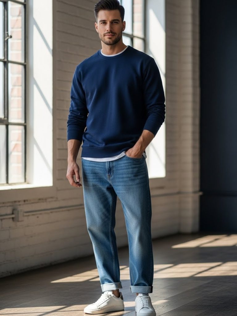 Crewneck sweatshirts give a clean look. Loose jeans add comfort. This outfit is easy to wear and works for many settings.