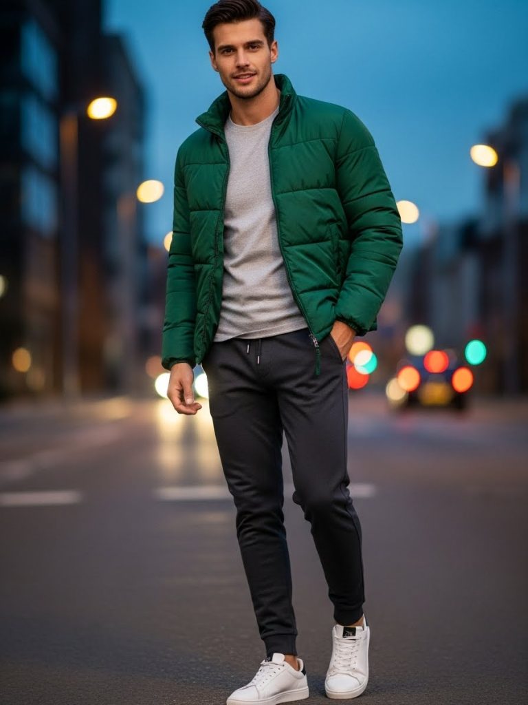 A lightweight puffer jacket adds warmth and style. Pair it with joggers and sneakers. This outfit is perfect for cold mornings and relaxed days.