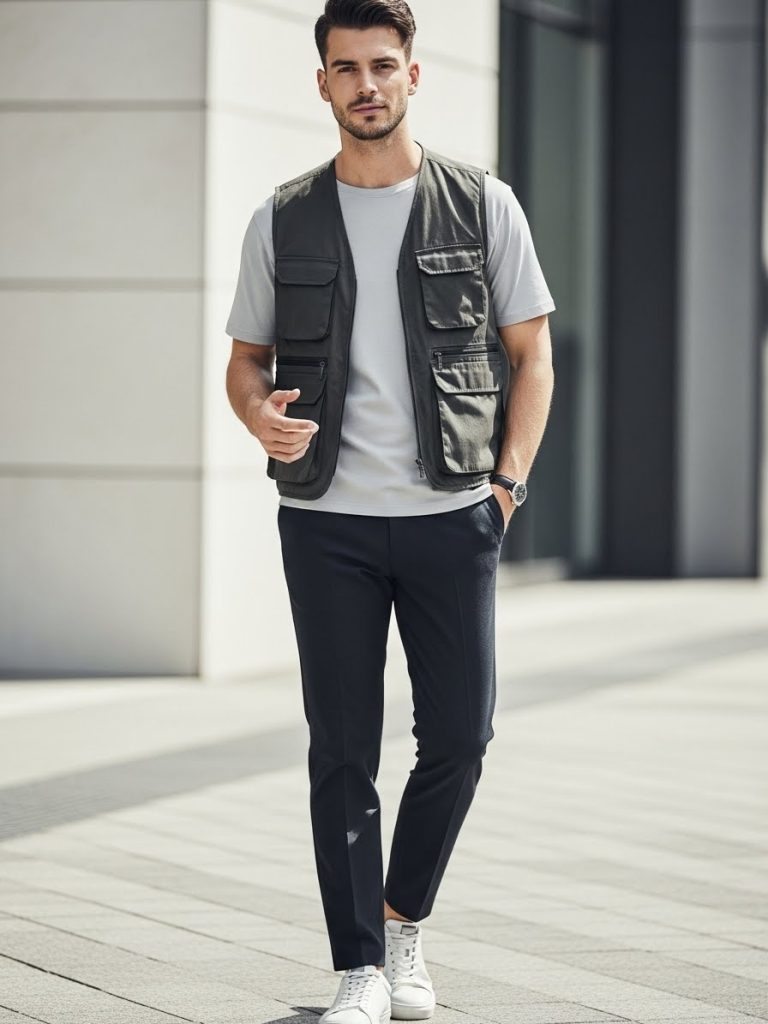 Utility vests are trending in streetwear. Wear one over a basic tee with relaxed pants. This outfit feels modern and functional.
