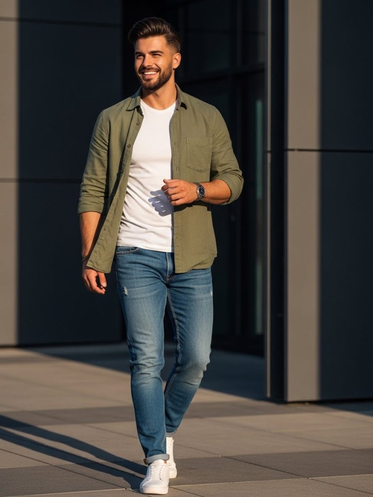 Layering adds interest. Wear a t-shirt under an open shirt with jeans. This outfit feels relaxed and stylish at the same time.