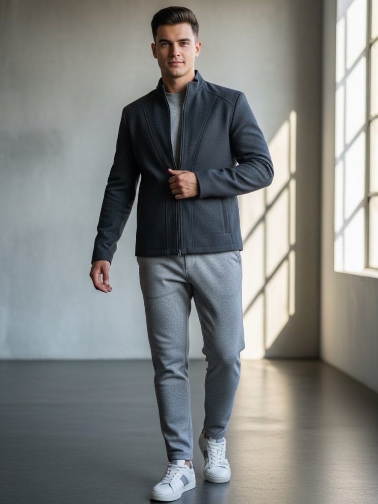 Mixing sweatpants with a structured jacket creates balance. This outfit shows you understand streetwear without looking lazy.