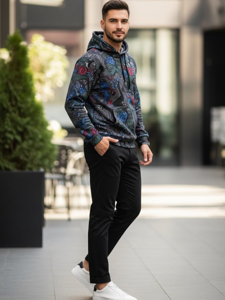Outfit Idea 19 – Printed Hoodie with Plain Pants