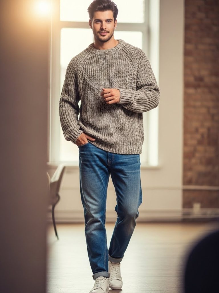 Knit sweaters are trending in men’s streetwear. Pair one with relaxed jeans for a cozy and stylish look.