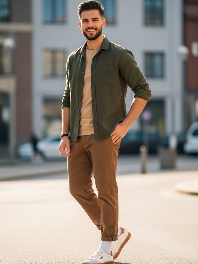 Earth tones like brown, beige, and olive are big in 2026. These colors feel calm and stylish. Pair with white or neutral sneakers.