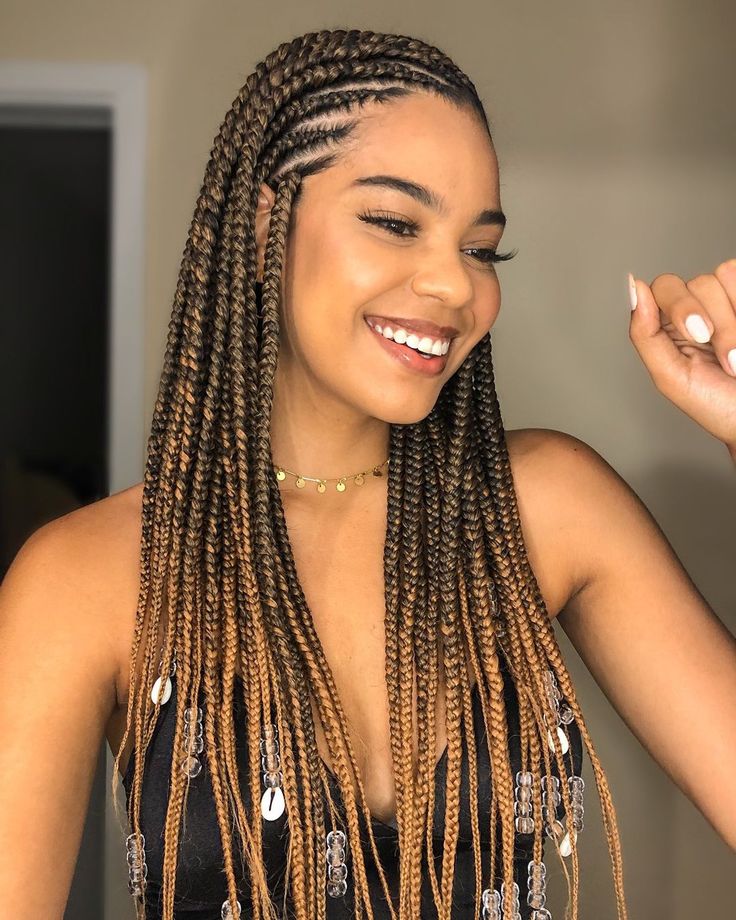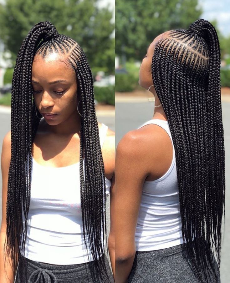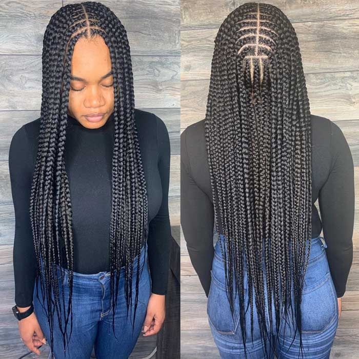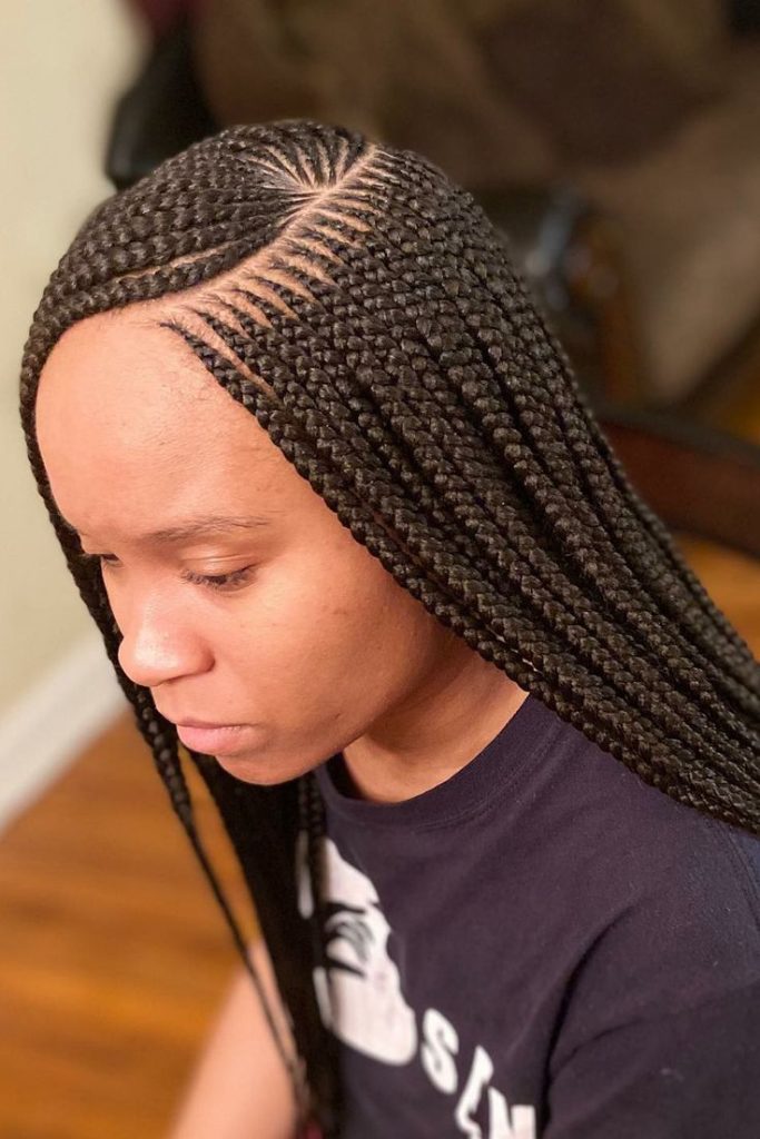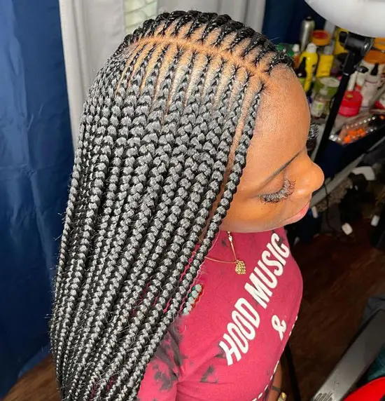 Feed-in braids give a natural look because the hair starts small and grows fuller. When done in two layers, the style looks clean and very modern. It is perfect if you love simple but classy braids.
