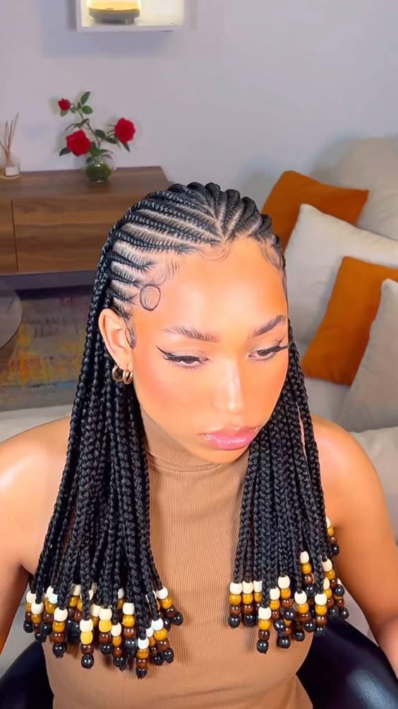 Beads add beauty and personality to braids. This style places beads mainly on the lower layer, making the hairstyle playful and attractive.