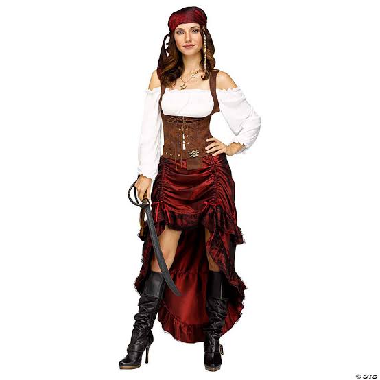 Off-shoulder blouse, corset belt, and a short skirt. Add a toy sword and boots — suddenly you’re the hottest pirate at the party.