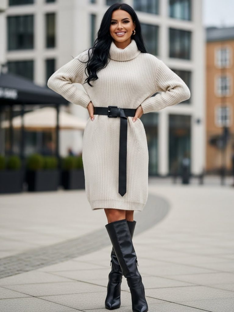 Outfit Idea 3 โ€“ Turtleneck Sweater Dress with Leather Boots